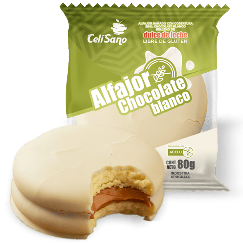 Alfajor banado en chocolate blanco, alfajor sin gluten relleno de dulce de leche con cobertura de chocolate. Una delicia artesanal apta para celíacos. Perfecto para acompañar tu café o como snack dulce. Categoría: Alfajores. Producto sin TACC. Industria uruguaya.