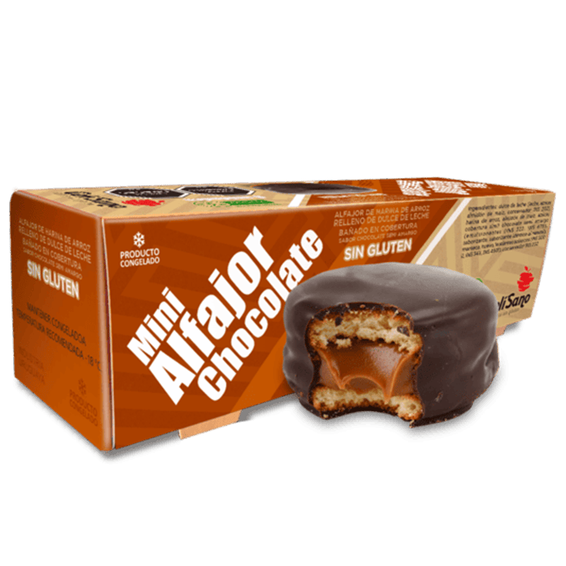 Alfajores cong. banados en choco negro – 6 uds x 50 grs c/u , alfajor sin gluten relleno de dulce de leche con cobertura de chocolate. Una delicia artesanal apta para celíacos. Perfecto para acompañar tu café o como snack dulce. Categoría: Mini Alfajores. Producto sin TACC. Industria uruguaya.