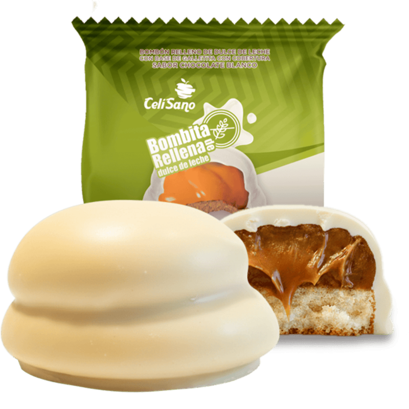 Bombitas rellena de dulce de leche banada en choco blanco 30 grs, producto sin gluten elaborado artesanalmente por Celisano. Apto para celíacos, congelado para conservar su frescura y sabor.Categoría: Bombitas. Producto sin TACC. Industria uruguaya.